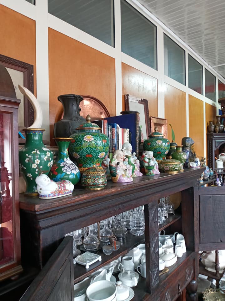 Antiguidades variadas, como móveis, objetos decorativos e artefactos históricos.