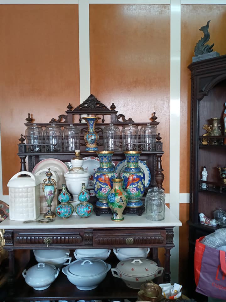 Antiguidades variadas, como móveis, objetos decorativos e artefactos históricos.